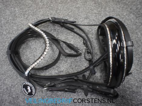 1 x Profi-Rider Luxe Hoofdstel, Big Stone In Frontriem, Strass in Neusriem, Anatomisch en Zacht Kopstuk, Lak Neusriem, Zwart, Full